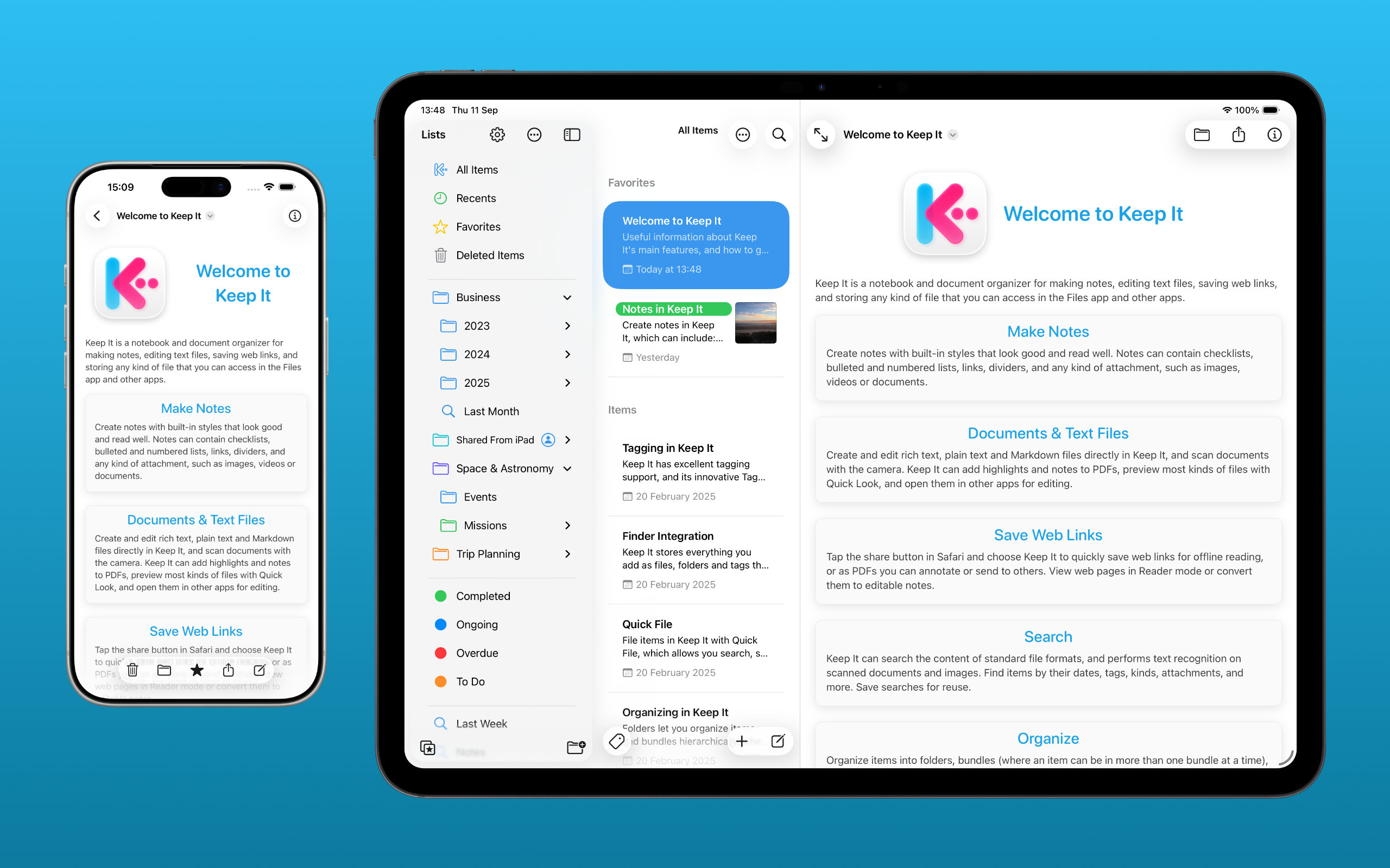 Keep It 2 adds Quick Open and Quick File on iPad, minimal web pages, the ability to reorder lists, a redesigned items list, favorites at the top, a streamlined UI for editing and viewing items, improved text formatting controls, improved search, improved PDF viewing and Markdown previews, improved linking between items, the ability to convert, merge and duplicate items, tags in the Files app, and more. See What’s New In Keep It 2 for iPad and iPhone for a full list.