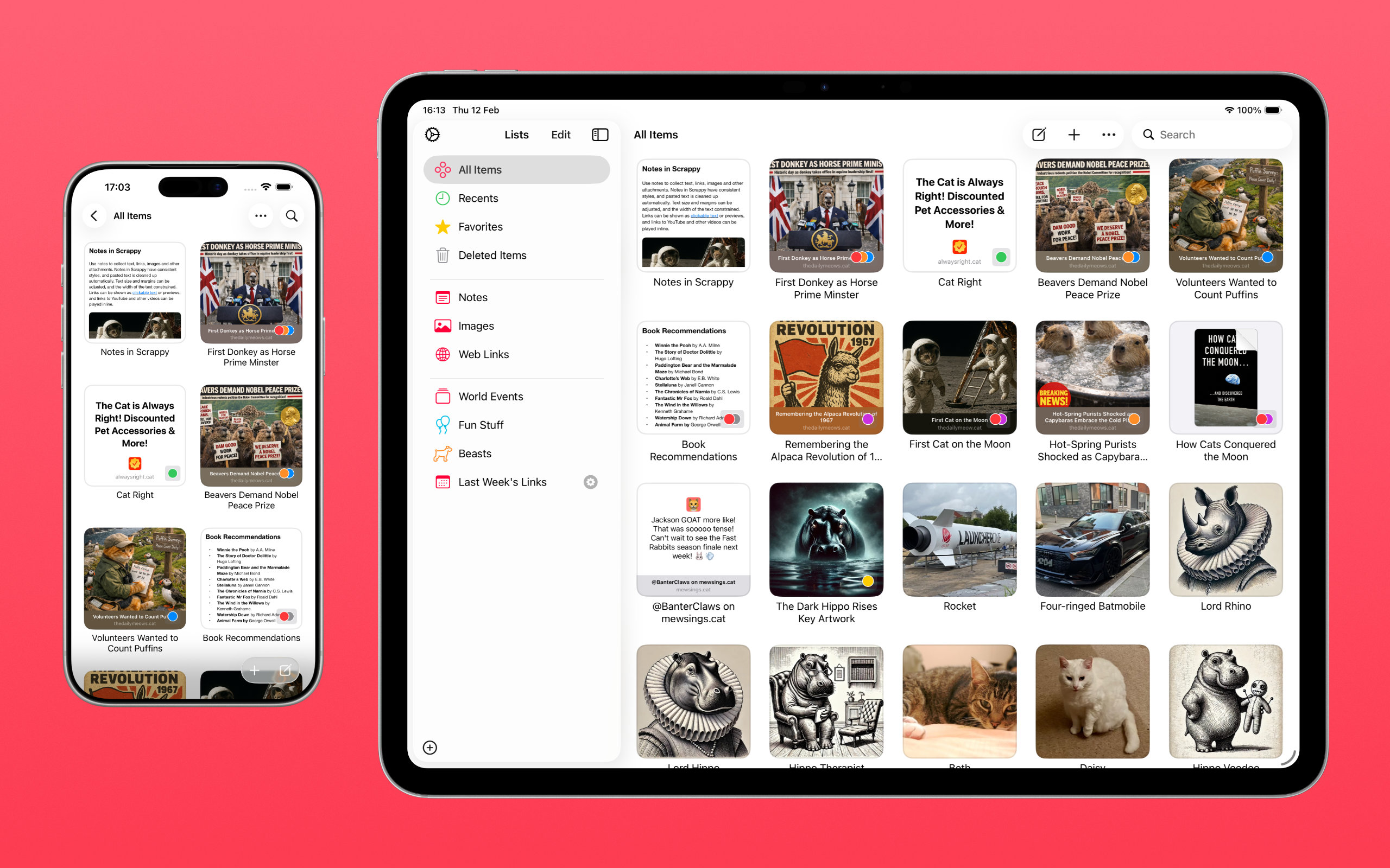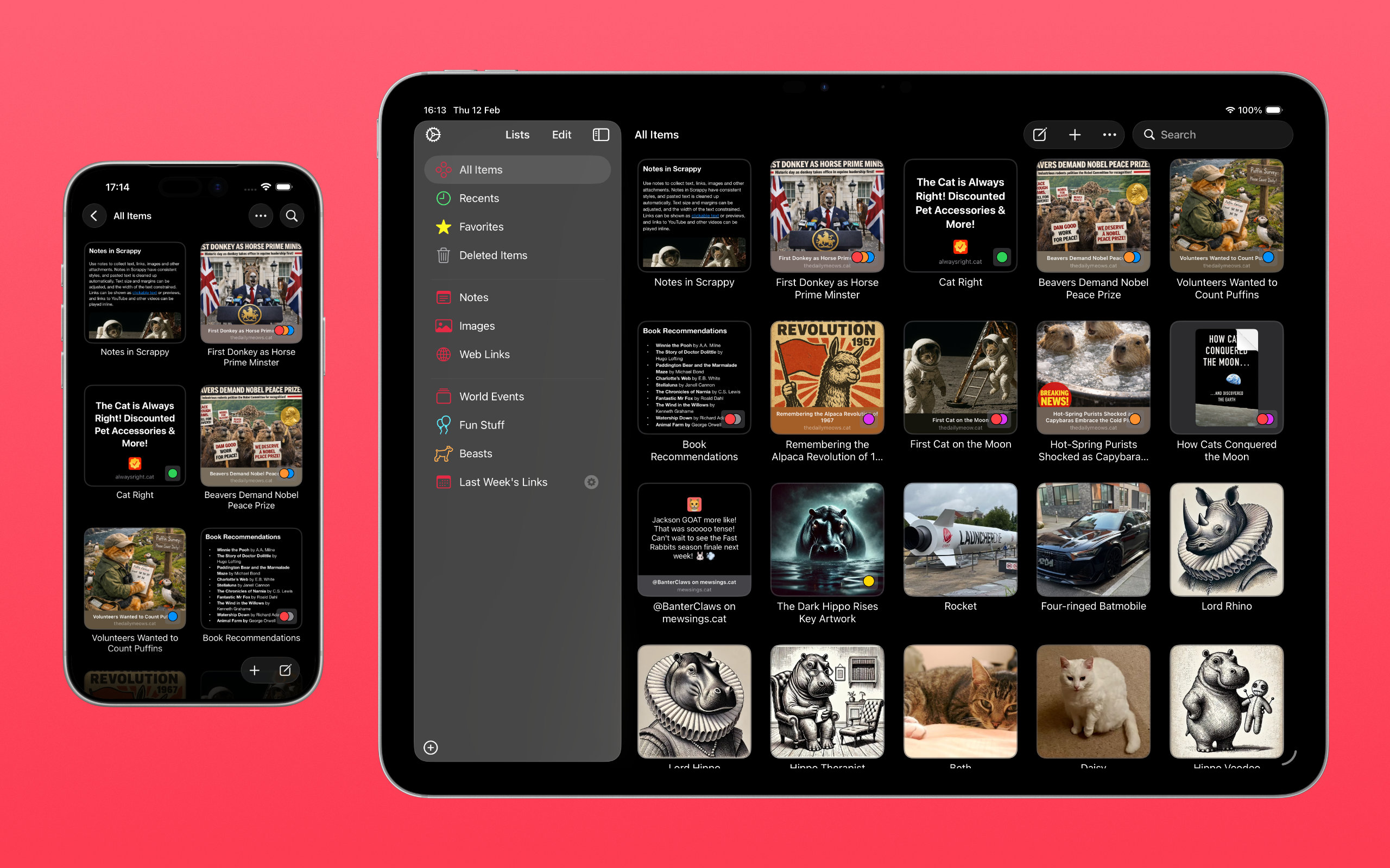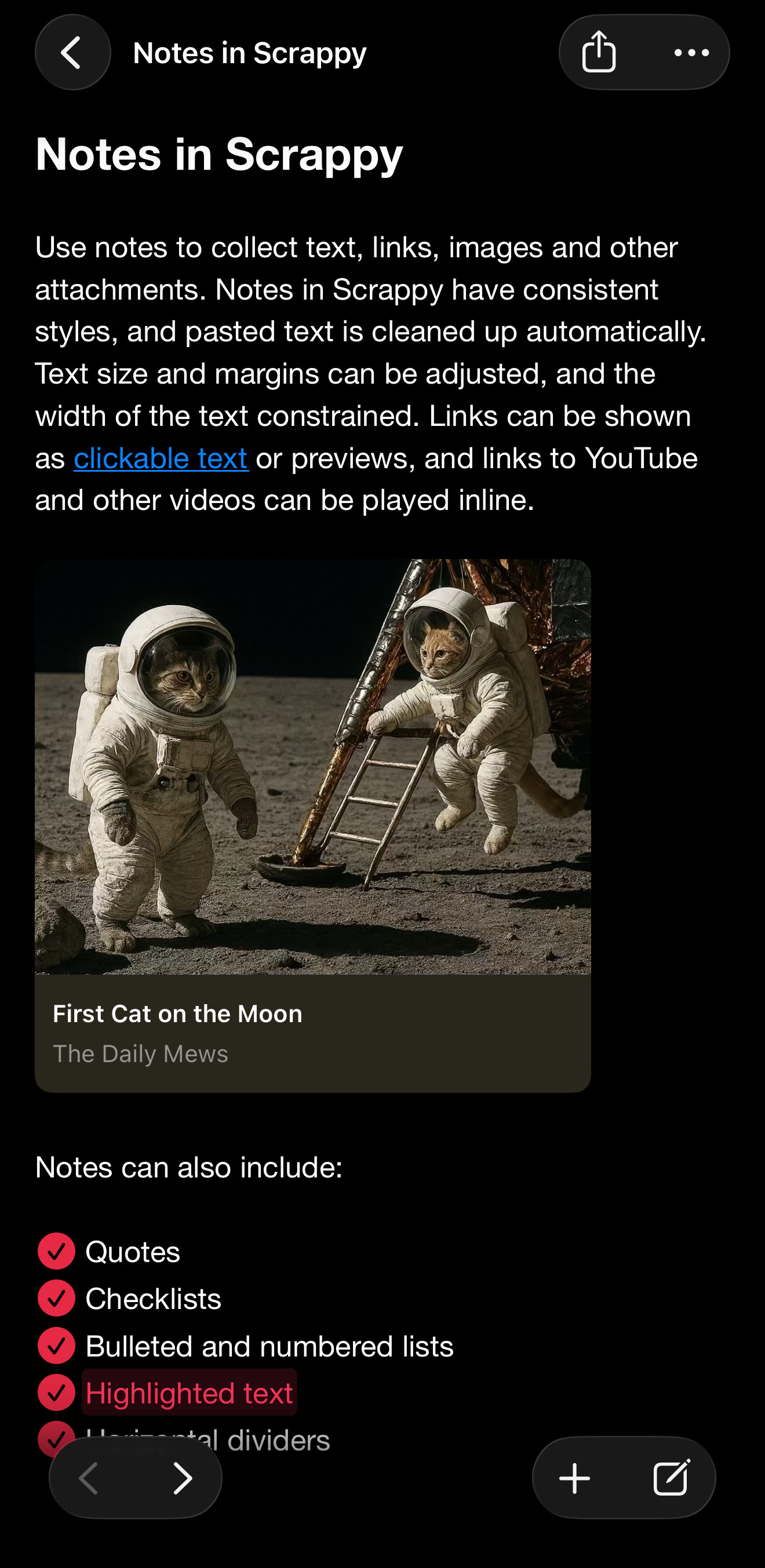 When you save a web link to Scrappy, what’s shown adapts to the content. Articles resemble reader mode in web browsers with a featured image and cleaned-up text, and other links, such as YouTube links and social media posts, will appear as cards with a summary and image or playable video.